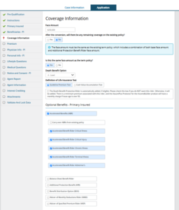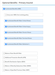 - On the Coverage tab, select all desired riders. If you are adding PCC, you must select Accelerated Benefits (ABR) and then click each Accelerated Benefits Rider – Critical Illness through Alzheimer’s.