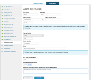 On the Agent Information tab, indicate that you would like to add Premium Chronic Care rider and the percentage desired.