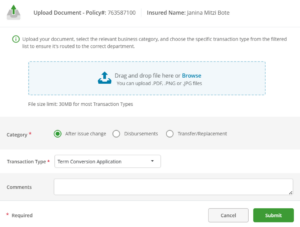 - You will have the option to upload an illustration at the end of the Term Conversation e-app; or you can upload it using the Upload A Form feature found in Quick Tools for your inforce Term Policy.