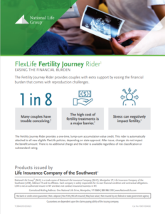 Understanding these significant costs, National Life Group offers the Fertility Journey Rider, via life insurance policies, to provide financial support to couples undergoing fertility treatments. This rider offers a one-time, lump-sum accumulation value credit and is automatically included with all new eligible FlexLife policies, subject to state approval. Notably, it is available at no additional cost, regardless of risk classification or substandard rating. Give your clients the support they need by talking to them about the Fertility Journey Rider.