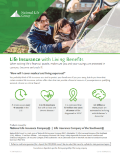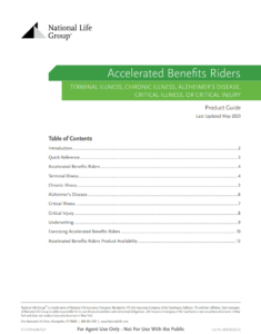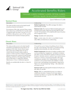 For clients seeking the death benefit protection of life insurance while also addressing their living needs, consider life insurance with Accelerated Benefits Riders (ABRs) or Living Benefits from the insurance companies of National Life Group. These options offer a safety net for a qualifying illness or injury. ABRs provide a benefit that can be used for any purpose, such as covering medical expenses not included in insurance, experimental treatments, or household bills.