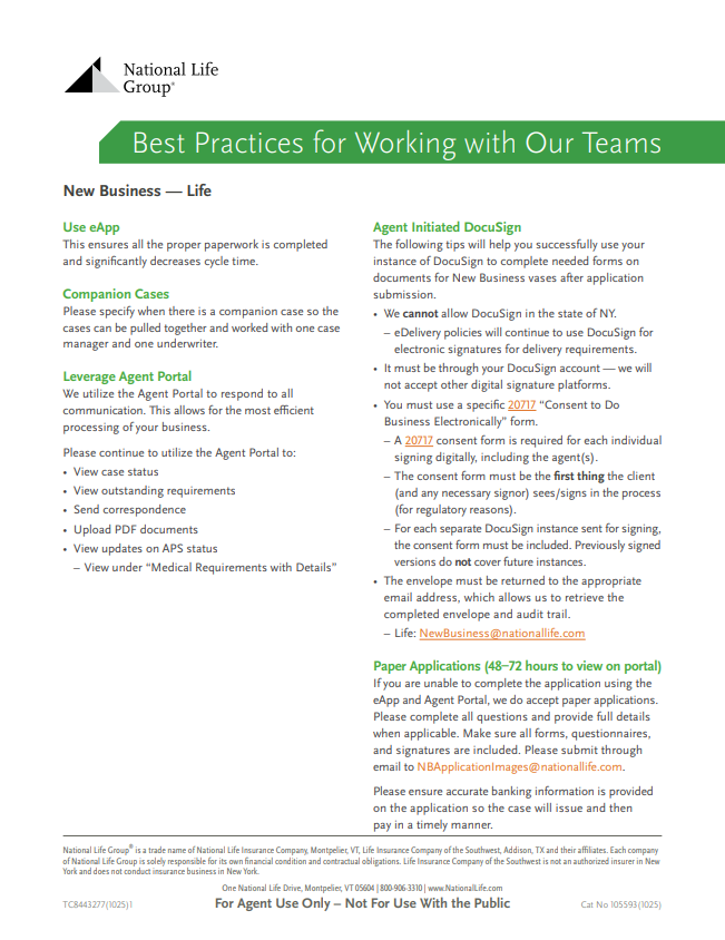 - Best Practices for Working with Our Teams: This guide is your one-stop shop for information and tips related to New Business and Underwriting, as well as useful contact information.